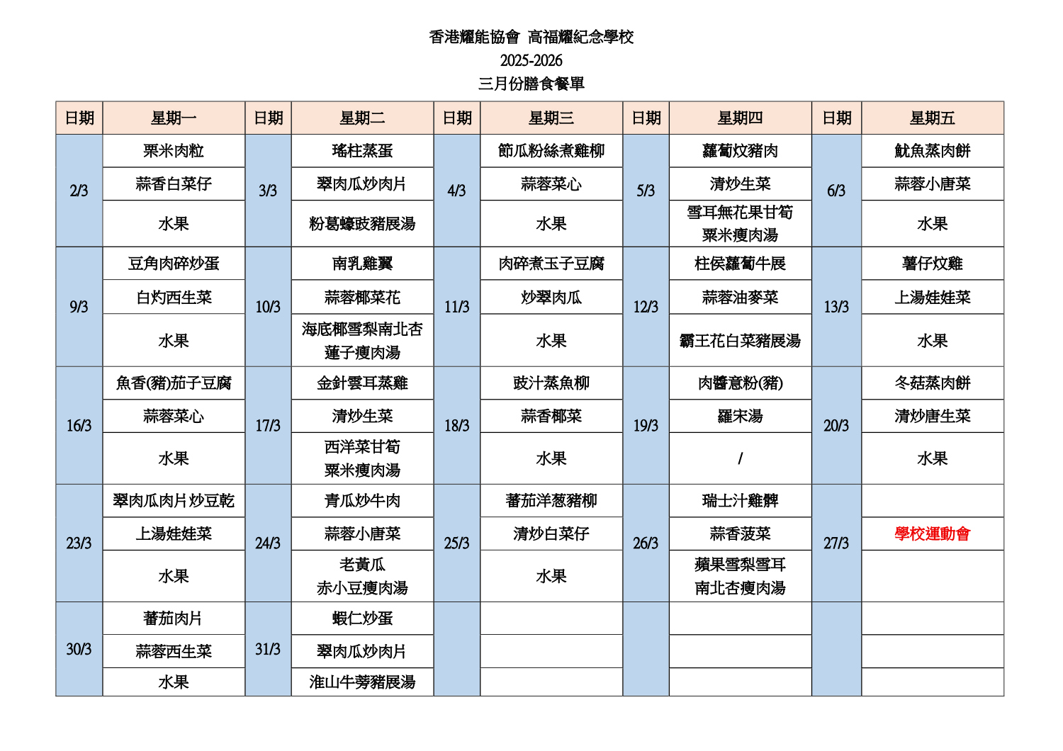 二零二六年, 三月份膳食餐單